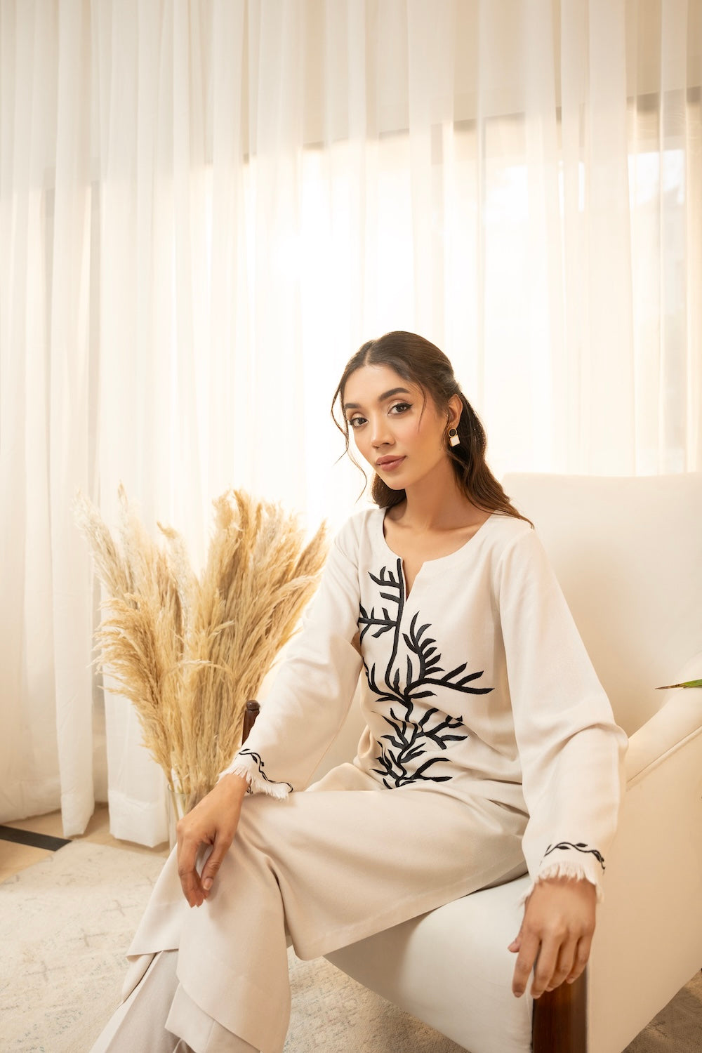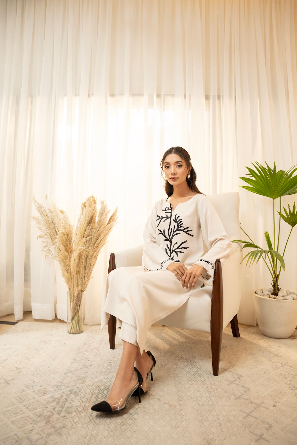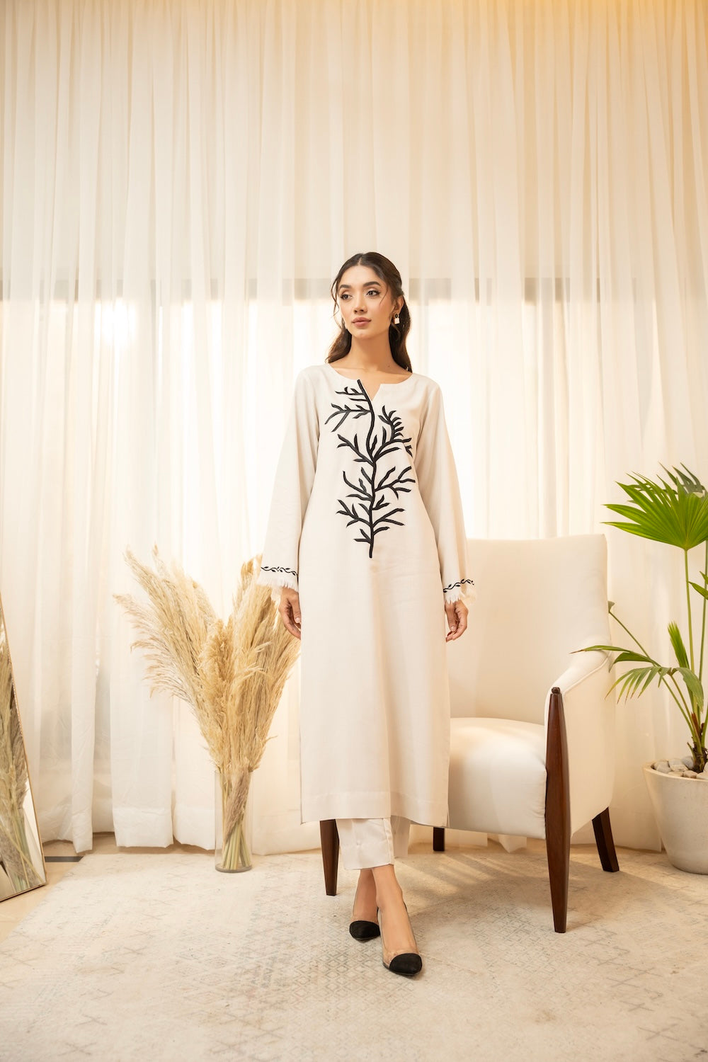 Off-white is the go-to color for this season - this silhouette features an exquisite style of black embroidery making it perfect for the season! It is paired with plain pants.
