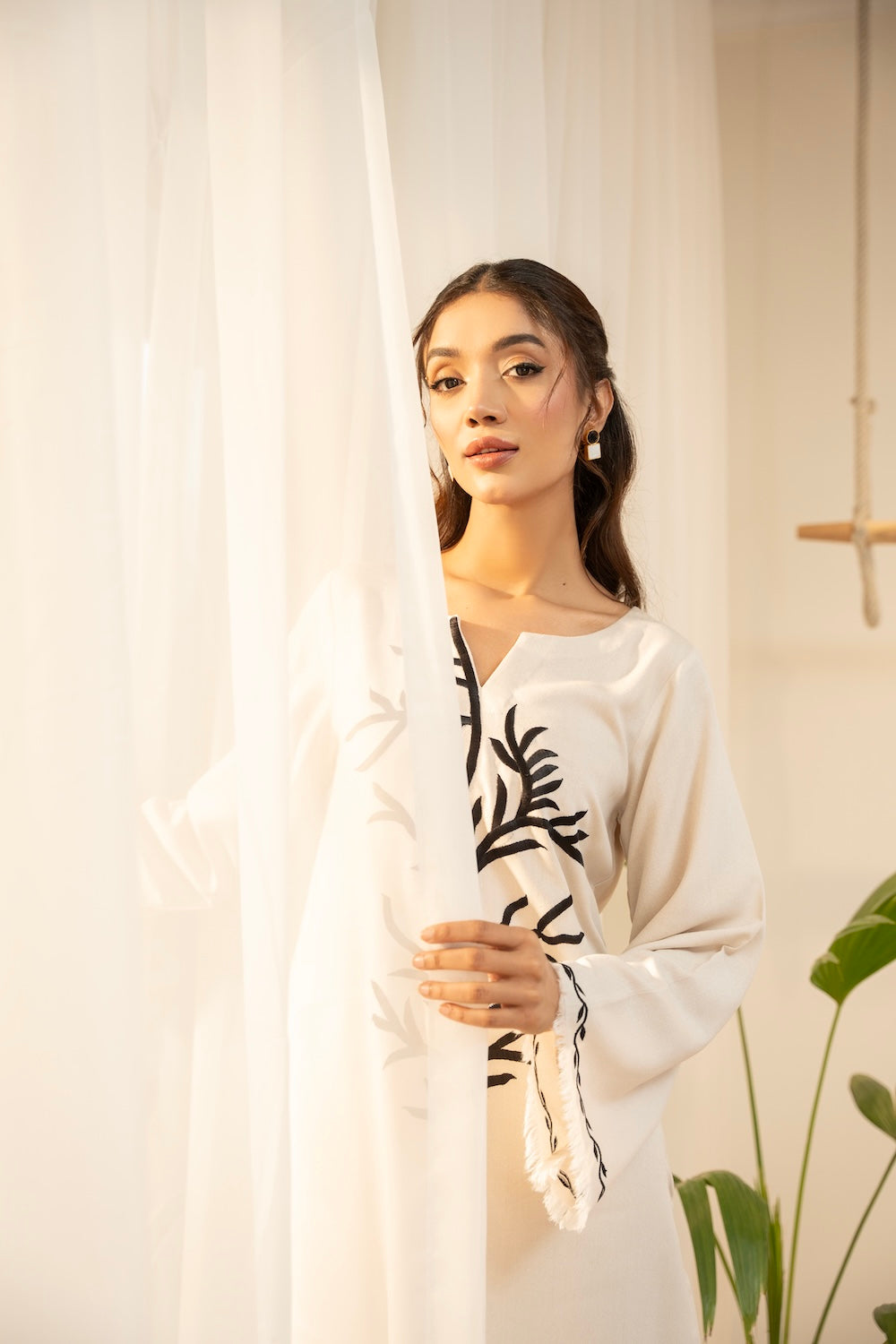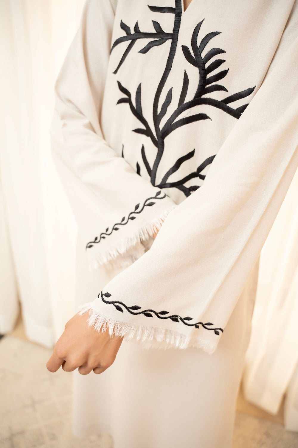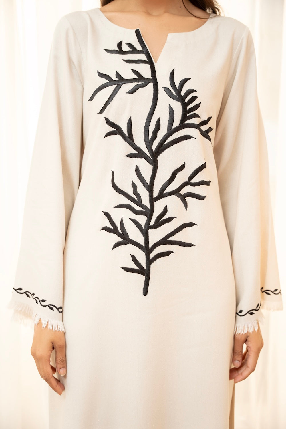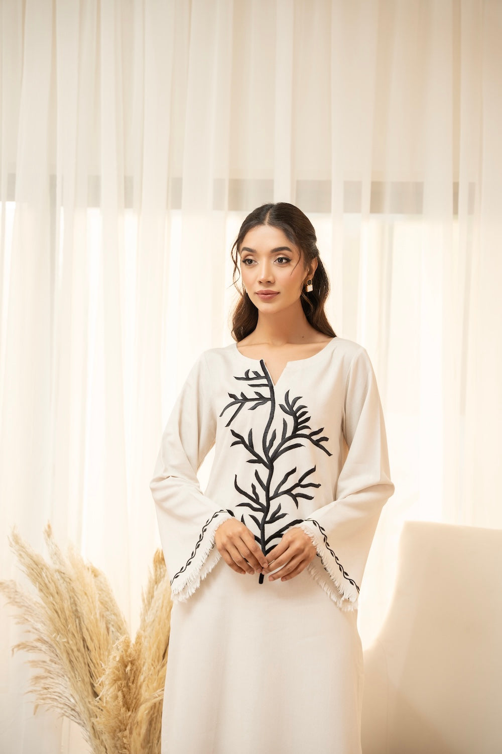 Off-white is the go-to color for this season - this silhouette features an exquisite style of black embroidery making it perfect for the season! It is paired with plain pants.